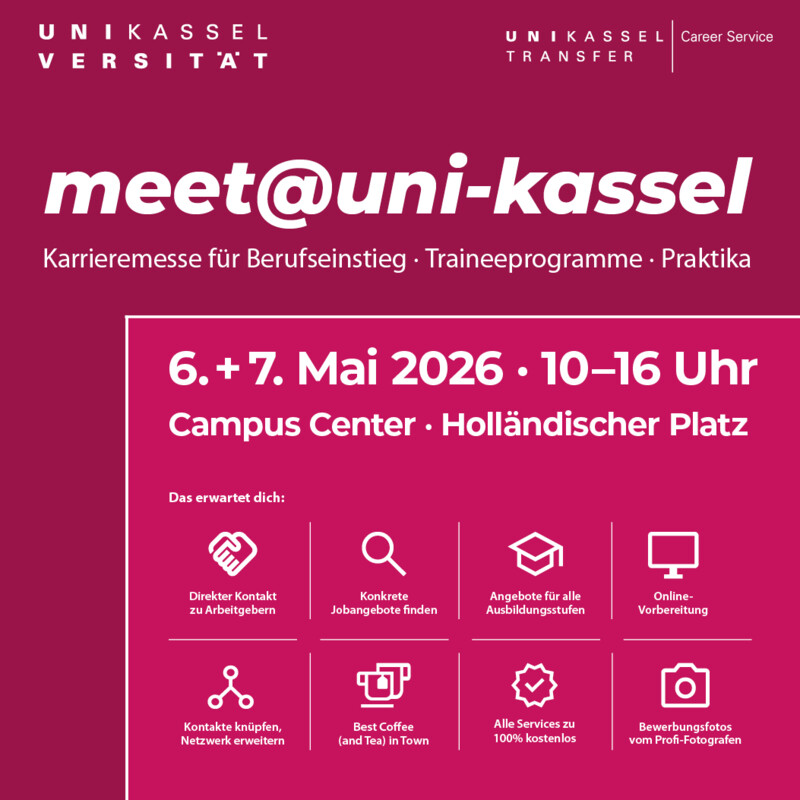 Am Mittwoch, 06. Mai und Donnerstag, 07. Mai findet die nächste Firmenkontaktmesse meet@uni-kassel als zweitätige Messe statt.